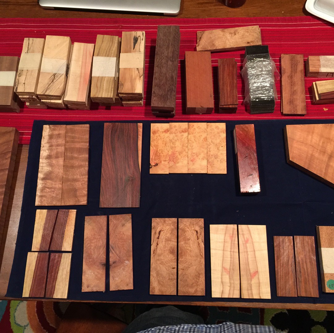 I typically have a decent selection of wood and micarta on hand at any given time. If you have a specific material in mind, just let me know, I'm willing to work with you to make something unique if desired.