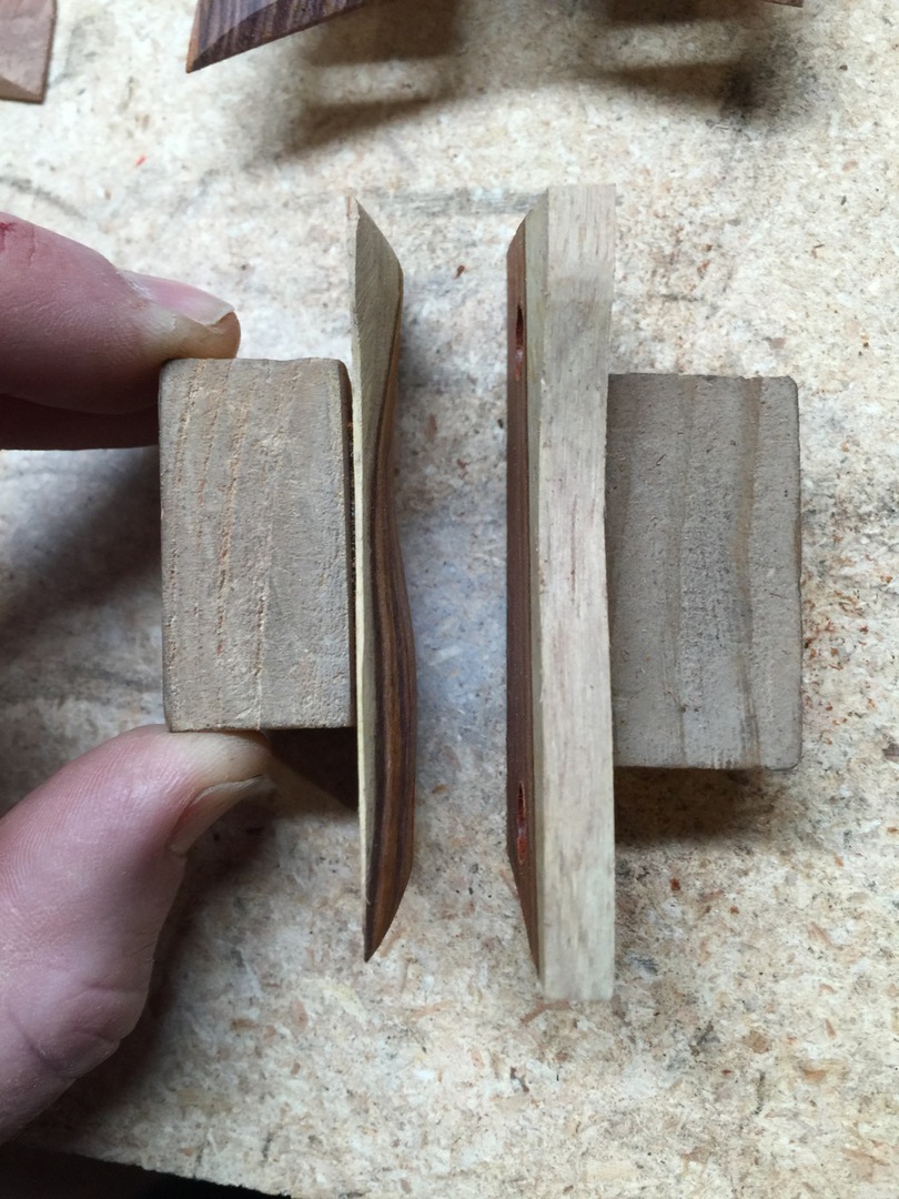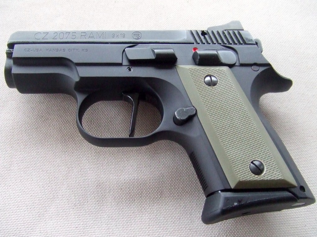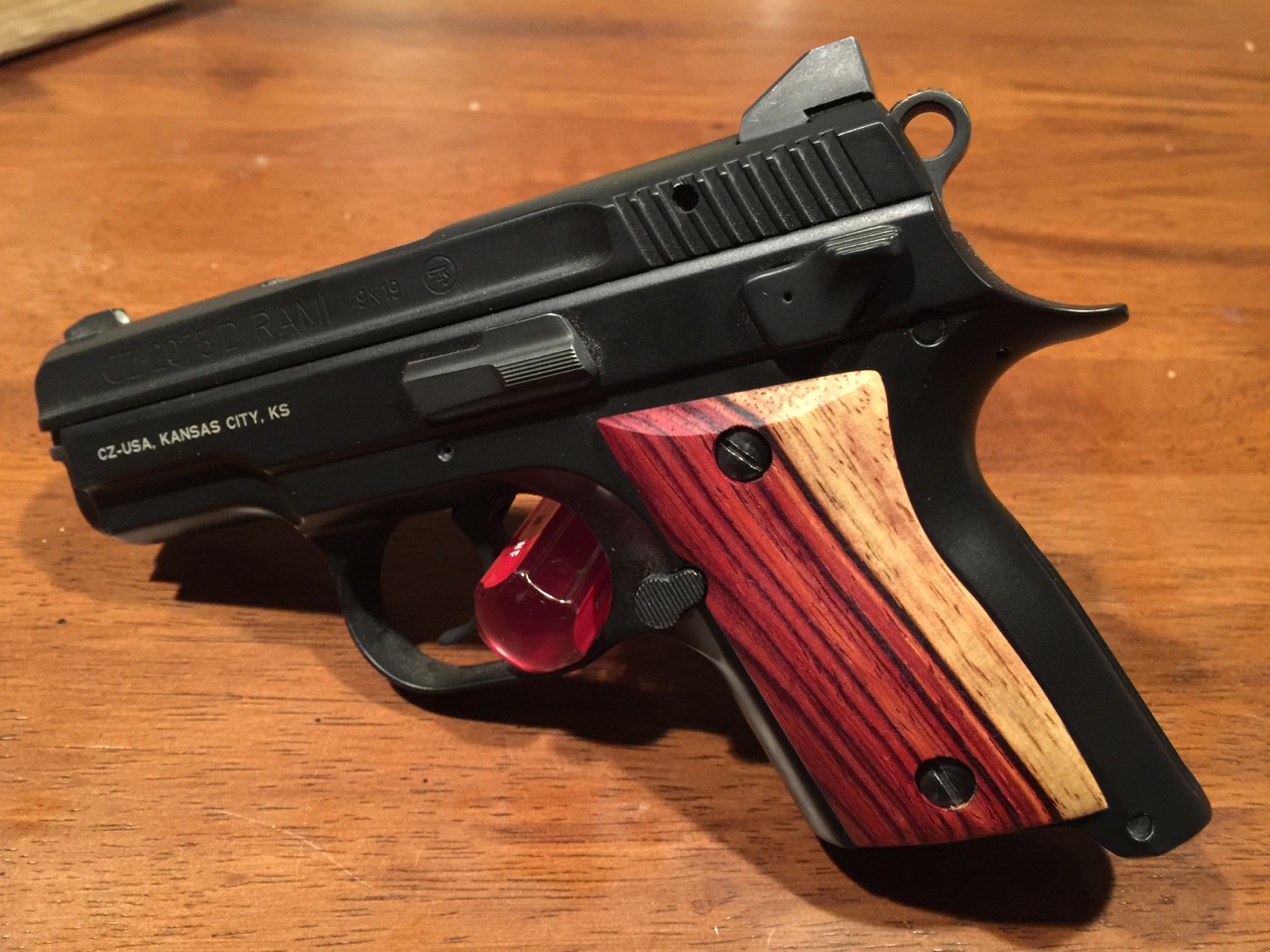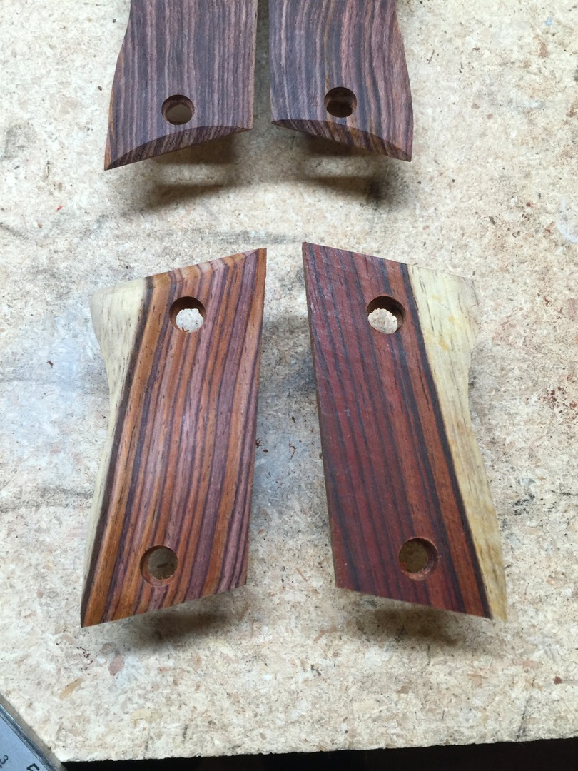 Had a customer decide that he wanted to see what it would feel like to have grips with a thumb rest and swell for a RAMI. So he took a set of plastic compact grips and trimmed, sanded, and added a little expoxy until it fit what he had in mind. Then he sent them to me and I replicated them in wood and micarta. The dimensions are similar to factory P-01 and SP-01 grips for thickness overall. I really like how it helps secure my grip as I use a two fingered grip on my RAMI.